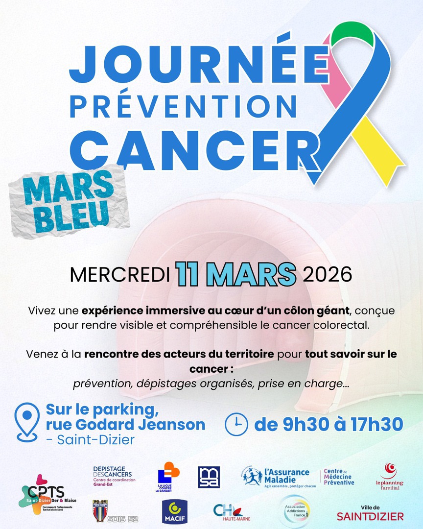 Mercredi 11 mars 2026, la CPTS Saint-Dizier Der & Blaise vous propose une journée de prévention du cancer, de 9h30 à 17h30, sur le parking rue Godard Jeanson.
